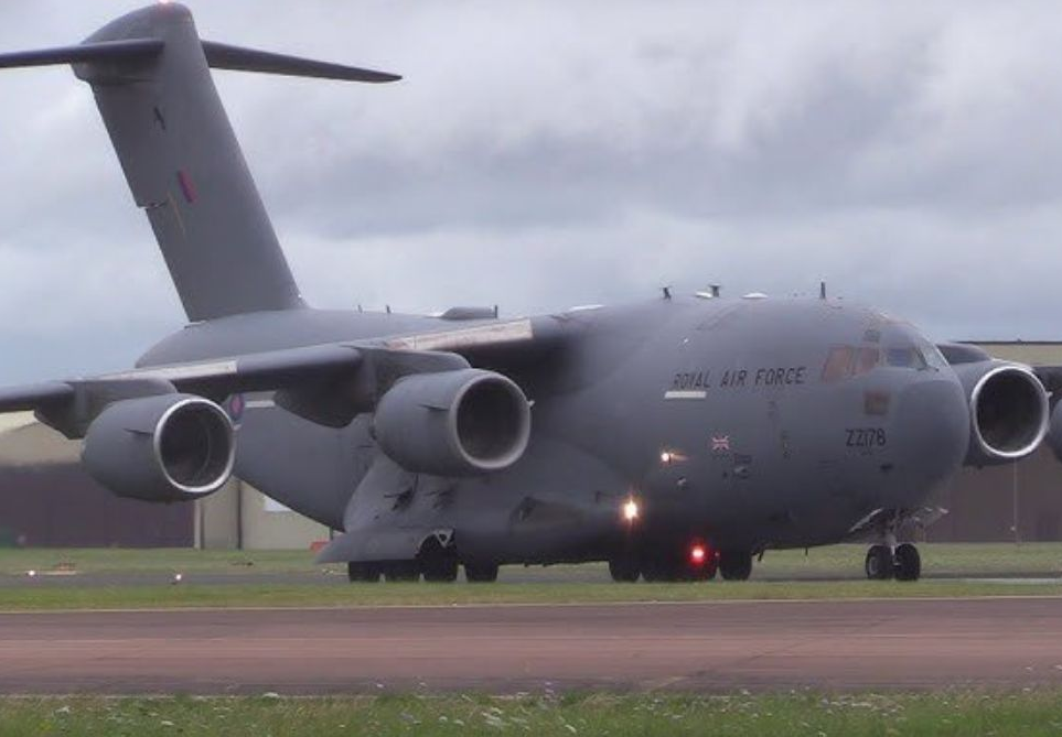 © APA | ABŞ Hərbi Hava Qüvvələrinə məxsus C‑17A Globemaster təyyarəsi Böyük Britaniyada yerləşən RAF Fairford bazasında